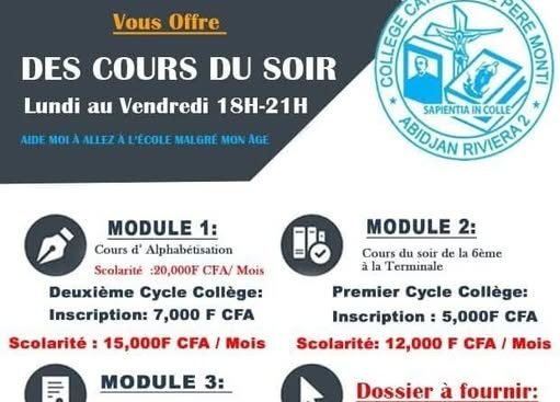 Cour du soir COPEMA (Collège Catholique Père Monti d’Abidjan) est un établissement secondaire mixte fondé et géré par les réligieux de la Congrégation des Fils de l’Immaculée Conception (CFIC) dans l’Eglise Catholique Romaine de l’Archidiocèse d’Abidjan. il accueille les enfants de toute race et de toute religion sans distinction aucune pour leur formation